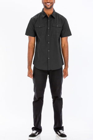Men's Double Breast Pocket Black Button Down Short Sleeve Shirt