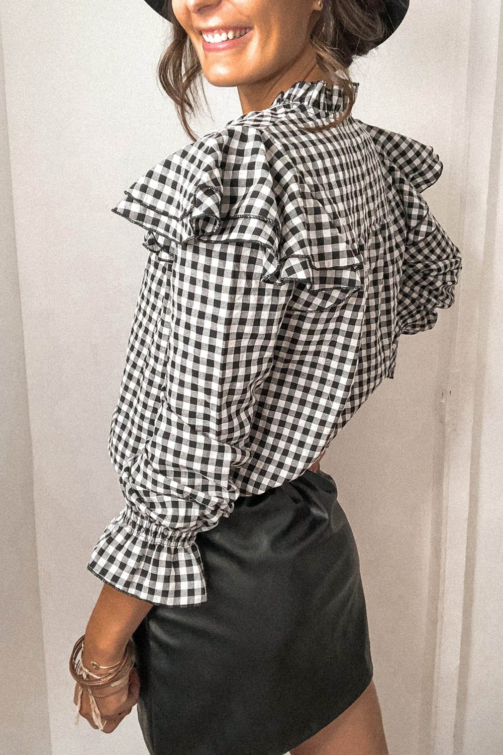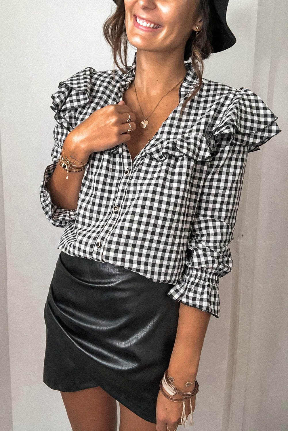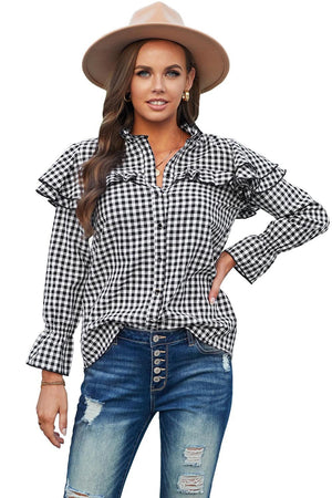 This black block styled shirt is a practical addition to your closet. Plain as can be is our motto and this ruffled button up shirt is a perfect staple of that motto.